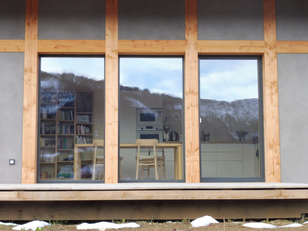 Maison presque passive, tout en matériaux biosourcés, des fondations au faîtage à l’exception près d’une bande de polystyrène de 40 cm en pied de murs. Les clients sont ravis de n’avoir dépensé que 5 € par mois pour se chauffer cet hiver (Poële à granules).
